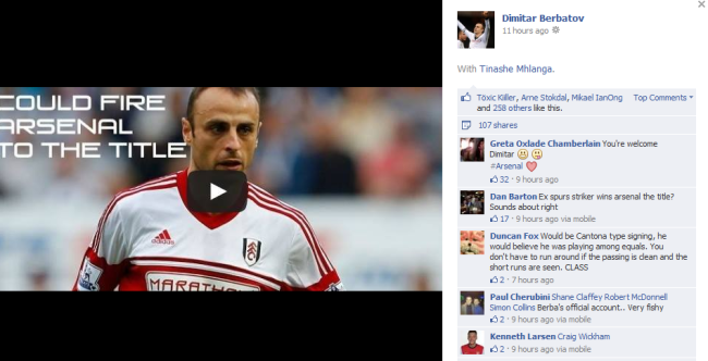 Berbatov vient en effet de partager une vidéo à sa gloire et titrée « Pourrait mener Arsenal vers le titre » .