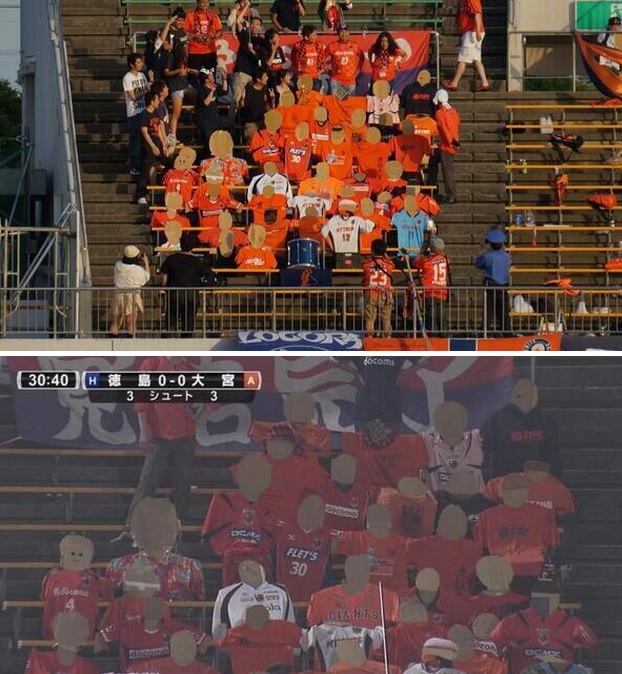 Mal barrés en championnat (avant-dernier de J-League avec 13 points après 14 journées), les supporters du club japonais d’Omiya Ardija ont trouvé la solution pour pallier le problème de fréquentation de leur stade.Ils ont en effet décidé de construire des fans en carton et de les habiller aux couleurs du club pour laisser croire qu’ils sont plus nombreux à pousser leur équipe. Ni vu, ni connu.Ils font même la ola.