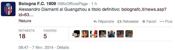 L’international italien Alessandro Diamanti (17 sélections) va poursuivre sa carrière en Chine. Le joueur de 30 ans quitte Bologne pour le Guangzhou Evergrande, où il sera entraîné par son compatriote Marcello Lippi. La presse transalpine évoque un contrat de 9 millions d’euros sur trois ans. Cette saison, Diamanti avait déjà inscrit cinq buts en Serie A. Bonne année du cheval à toi, Alessandro.