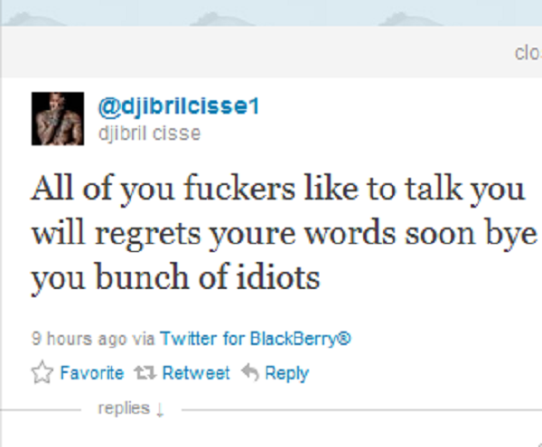Suite au piteux match nul et vierge de la Lazio face à Vaslui en Europa League, Djibril Cissé a fait chauffer son BlackBerry pour répondre à ses détracteurs via Twitter. « A tous les enculés qui aiment parler, vous regretterez bientôt vos paroles bande d’idiots » : la punchline est tombée dans la langue de Shakespeare sur le réseau social moins de deux heures après la fin de la rencontre.