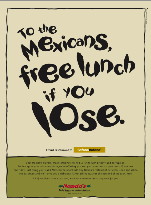 Le restaurant Nando’s proposera à tous les supporters mexicains munis d’un passeport un sandwich au poulet grillé gratuit en cas de défaite face à l’Afrique du Sud. C’est bon, le marketing.