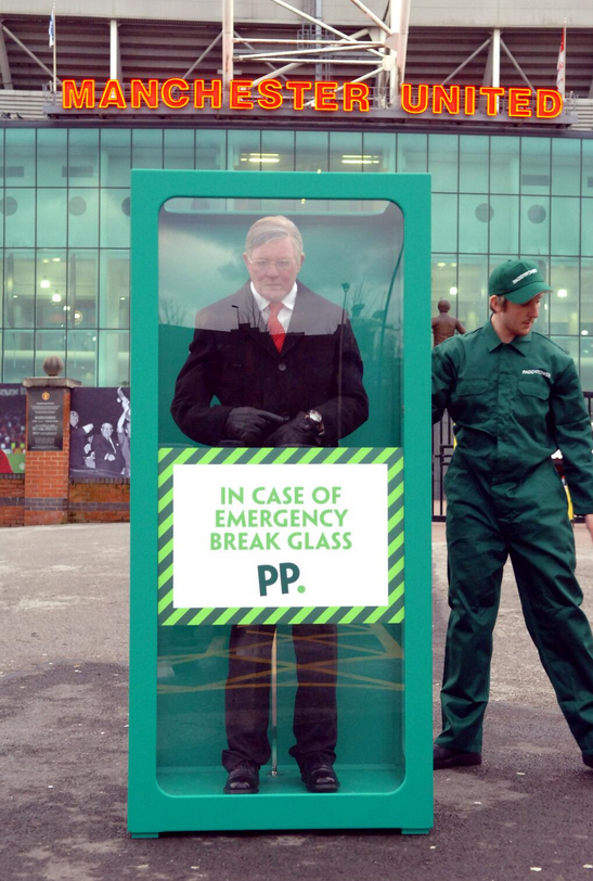 Les petits farceurs du service marketing et événementiel ont décidé d’installer une statue de cire de Sir Alex Ferguson, protégé par un vitrage sur lequel est inscrit la mention « briser la glace en cas d’urgence… » . L’agence a ensuite publié une photo de son chef d’œuvre sur son compte Twitter, qui se répand comme une traînée de poudre.