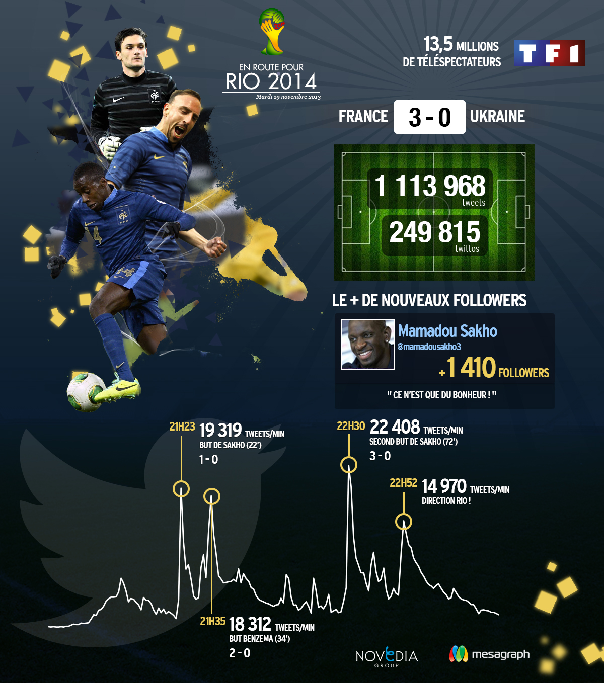 Mais la chaine n’est pas la seule à avoir profité de l’engouement généré par la qualification des Bleus. Sur Twitter, l’événement a atteint des sommets comme le montre cette infographie réalisée par Novedia.