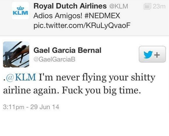 Fidèle supporter d’El Tri, le natif de Guadalajara n’a pas hésité à faire part de sa frustration en adressant à la compagnie aérienne néerlandaise un message plein d’attention. Pour info, Gael García Bernal pèse près de 2 millions de followers sur twitter. C’est le double de la Royal Dutch Airlines.