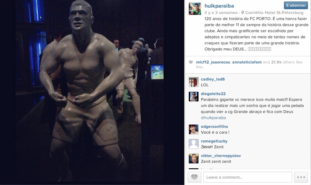 Hier le Zénith affrontait Porto en C1, et en retournant dans son ancien club pour la première fois depuis son transfert, Hulk a enfin pu admirer la statue à son effigie.