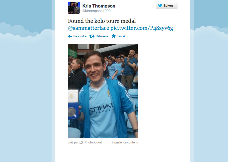 Peut-être agacé d’être resté sur le banc pour voir la victoire des siens lors du Community Shield face à Chelsea (3-2), Kolo Touré a balancé sa médaille au premier mec qu’il a croisé après le match. Par chance, le mec en question est un supporter de City et semble plutôt ravi du cadeau au vu de la photo qu’il a posté sur Twitter.