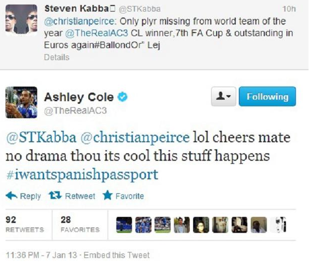 L’international anglais, lauréat de la dernière Ligue des champions et de la FA Cup, la septième de sa carrière, n’y figure pas, le Brésilien Marcelo lui étant préféré. Au lieu de s’insurger, l’ex de la sublime Cheryl Cole a préféré rire de la situation via Twitter. Dans une conversation avec Steve Kabba, joueur de Barnet, l’ancien Gunner a ironisé en tweetant qu’il devrait avoir un passeport espagnol pour être récompensé.