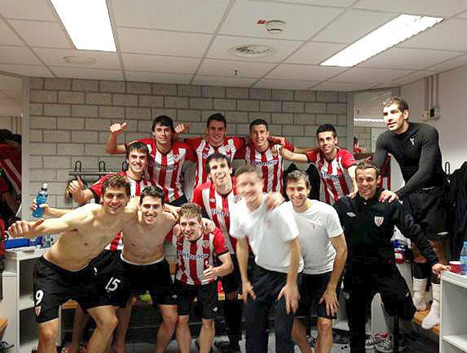 Forcément dans les vestiaires, les Basques sont contents, et font la fête. Dans ce genre de moments, y’en a toujours un qui fait chier tout le monde et propose de faire une photo de groupe. Les joueurs s’y prêtent gentiment et prennent leur plus belle pose.