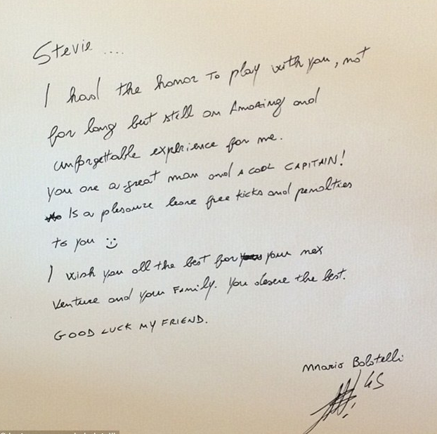 L’attaquant italien a posté sur son compte Instagram une lettre manuscrite à l’intention de son capitaine Steven Gerrard pour lui rendre hommage. Voici le contenu de la lettre, avec une mention spéciale pour le passage sur les coups francs et penaltys : « Stevie… J’ai eu l’honneur de jouer avec toi, pas longtemps, mais assez pour dire que c’est une incroyable et inoubliable expérience pour moi. Tu es un mec génial et un super capitaine ! C’est un plaisir de te laisser tirer les coups francs et les penaltys. Je vous souhaite le meilleur pour ta prochaine aventure, à toi et ta famille. Tu mérites le meilleur. Bonne chance mon ami. »