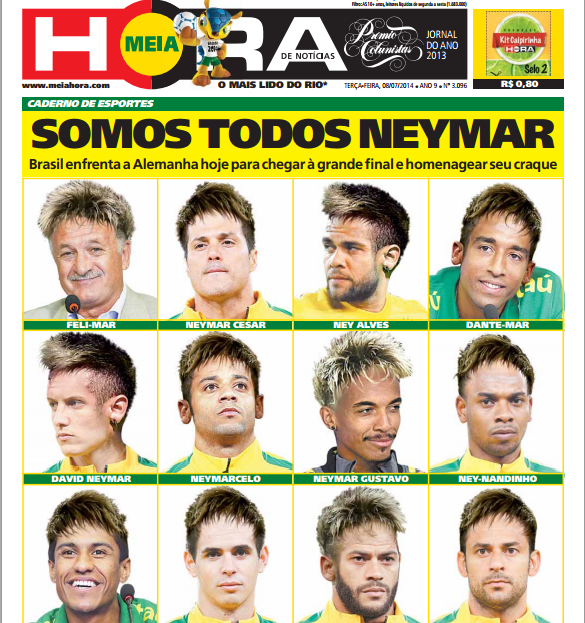 Aujourd’hui, la Une du quotidien brésilien Meia Hora affiche son soutien au joueur du FC Barcelone et aussi à toute la Seleção pour leur opposition contre l’Allemagne. L’occasion de voir ce à quoi les membres de l’équipe ressembleraient avec la crinière blonde du crack auriverde.