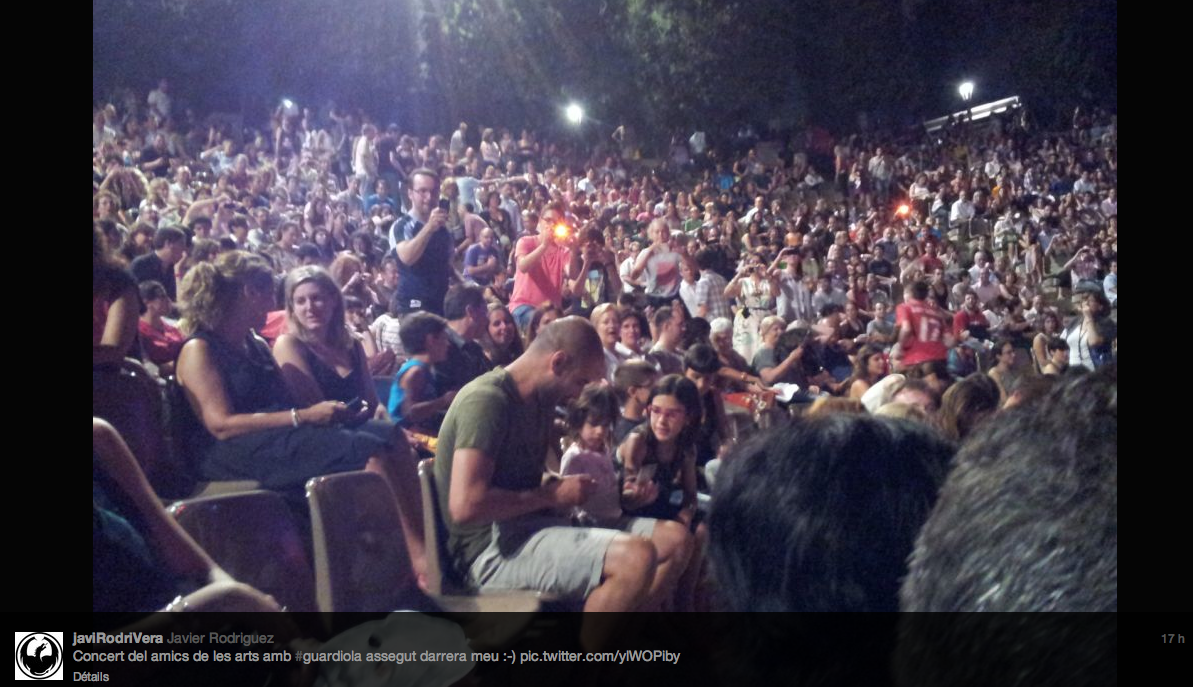 Tout le mois de juillet, la ville de Barcelone fête la musique catalane dans le cadre du festival « El Grec ». Jusque là, rien à voir avec le foot, sauf quand un invité très spécial se mêle à la fête.Désormais en vacances prolongées, Pep Guardiola avait décidé de se glisser parmi les milliers de fans du groupe « Els amics de les Arts » pour assister au concert de clôture. Une sortie évidemment pas passée inaperçue, puisque la foule s’est levée pour acclamer l’ancien joueur et entraîneur blaugrana à son arrivée dans les gradins. Difficile d’avoir une vie sociale normale à Barcelone quand on s’appelle Pep Guardiola…
