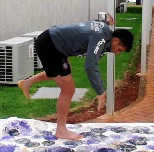 Paulo André, défenseur des Corinthians, passionné de musique, de littérature et de peinture – il est aussi artiste peintre pour le fun – a décidé de fêter la cinquième conquête du Brasileirao par le Timao de manière originale. Le Brésilien a peint une toile de 3 mètres sur 2,90, à partir d’empreintes de ballons, de mains, de pieds de joueurs et membres du staff des Corinthians. Explications: « L’équipe a bâti quelque chose de grand, un titre de champion. Rien de plus normal que de saluer cela avec un tableau. C’est un souvenir, et la preuve qu’on y est arrivé tous ensemble. J’ai choisi 38 pieds et mains pour les 38 journées du Brasileirao.«