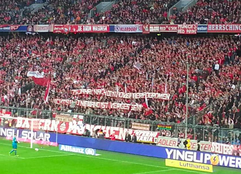 Du coup, les ultras du Bayern ont décidé de rendre hommage aux victimes du pogrom, en affichant deux banderoles à l’Allianz Arena lors du match face au FC Augsbourg: « 75 ans après les pogroms de novembre – Rien ni personne n’est oublié » .