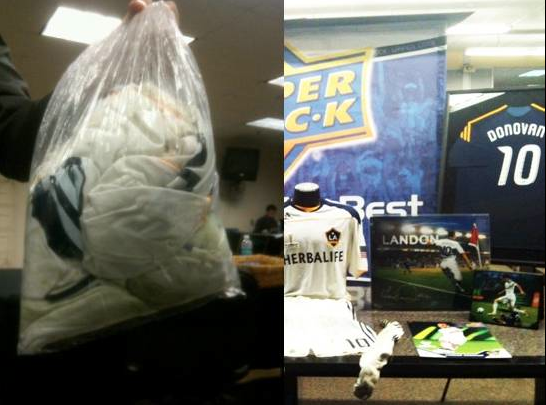 Sollicité par l’entreprise pour filer le maillot qu’il portait lors de la MLS Cup face au Dynamo Houston, le Californien a envoyé la totalité de son équipement, le tout arrosé de bière et de champagne. Classe, le staff des Galaxy s’en est excusé, en ajoutant un petit post-it avec la livraison, sur lequel il était inscrit : « Nous nous excusons d’avance pour l’odeur, et vous recommandons de laisser le tout s’aérer un peu, pour venir à bout des odeur de champagne, de bière, de sueur et de pluie séchée. Il n’y a aucun doute de l’authenticité du maillot, ça c’est certains. Nous vous avons mis un petit bonus avec : il y a les chaussettes » .