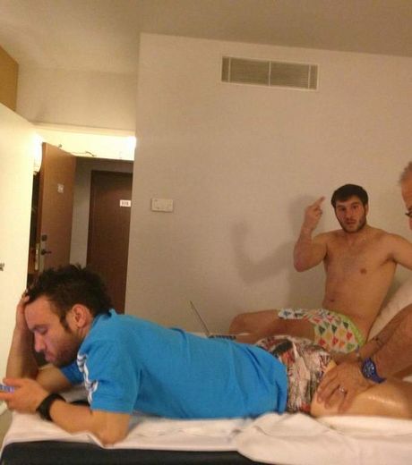 Joey le fou a posté récemment une photo sur Twitter où on aperçoit Valbuena et Gignac dans une chambre. Le premier, qui vient visiblement de recevoir un sale texto, se fait tranquillement masser l’arrière-train. Le second n’a, lui, pas apprécié de se faire prendre en photo et l’a gentiment fait savoir au British en lui tendant son majeur.