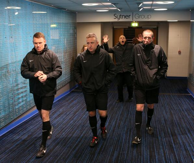 Et c’est Howard Webb qui s’y est visiblement mis. Quatrième arbitre lors de la victoire fleuve, 6-0, de Manchester City face à West Ham hier soir (demi-finale de League Cup), l’arbitre le plus célèbre depuis Pierluigi Collina s’est fait une joie de s’incruster dans une photo des trois officiels.
