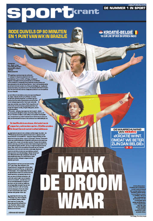 Pour encourager son équipe, le quotidien flamand Het Laatste Nieuws a réalisé un montage mettant en scène le défenseur Axel Witsel et l’ntraîneur Marc Wilmots, bras écartés, à la manière du Christ rédempteur dominant Rio.