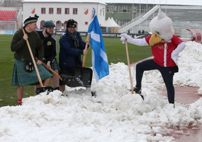 Mardi, avant la rencontre contre la Serbie, des inconditionnels de la Tartan Army sapés avec leurs kilts traditionnels sont venus déblayer le terrain recouvert de neige du stade de Karadjordje. Ce match des éliminatoires du Mondial 2014 du groupe A risquait notamment d’être reporté en raison des intempéries. Des efforts vains puisque les Écossais se sont inclinés (2-0) et n’ont plus aucun espoir de se qualifier pour le Brésil.