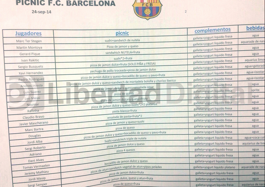Leur rédaction s’est en effet procuré la feuille où figurent les menus des joueurs blaugrana avant les rencontres. On y découvre par exemple que la pizza est très en vogue. Plus sage, Javier Maschernao opte pour une salade de pâtes, tandis que Marc Ter Stegen se sustente avec des sushis et un sandwich au Nutella.