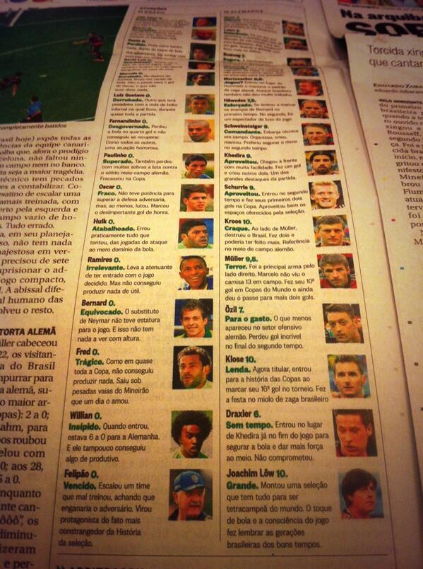 Plongée dans la honte, c’est toute une nation que la Mannschaft a humiliée en demi-finale de Coupe du monde. Mais si le Brésil admet la supériorité des joueurs allemands, la presse locale a également tenu à faire remarquer les piètres prestations des Auriverde, tous aussi décevants les uns que les autres. En témoigne les notes décernées par le quotidien brésilien O Globo aux joueurs de la Seleção au lendemain du Mineirazo.
