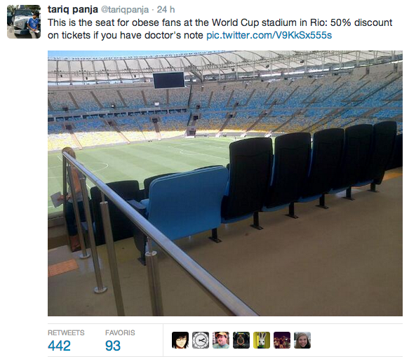Ainsi, le journaliste sportif Tariq Panja, en visite au Maracana, a pu apercevoir les sièges prévus à l’usage des personnes souffrant d’obésité, soit pesant plus de 150 kilos.