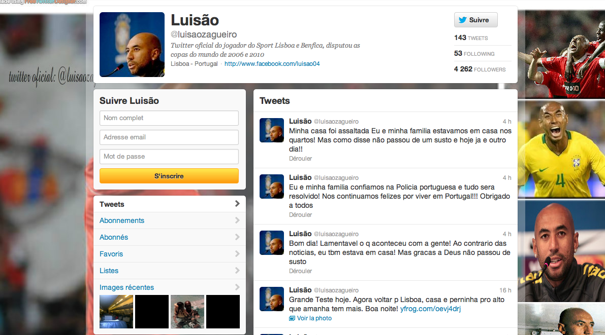 Pour déclarer un cambriolage, il y a la police et… Twitter. Le défenseur portugais Luisão a réveillé ses plus de 4 000 followers en annonçant la mauvaise nouvelle : « Ma maison a été cambriolée. Moi et ma famille étions dans nos chambres (…) Aujourd’hui est un autre jour et nous faisons confiance à la police portugaise. Nous continuons à être heureux de vivre au Portugal !!! » a tweeté le joueur du Benfica, qui souhaitait visiblement partager ce traumatisme au grand jour.