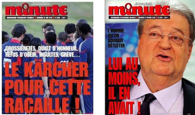 Minute, c’est « L’hebdomadaire politiquement incorrect », comme ils disent. Traduction : un canard plus à droite que le plus à droite de tes copains, dont les Unes feraient rougir n’importe quel rédacteur en chef de L’Equipe du 19 juin 2010.