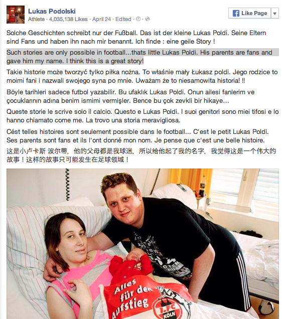 Depuis lundi dernier, les fans de Cologne sont en joie puisqu’ils sont assurés d’être promus en première division la saison prochaine. La légende locale et fervent supporter des Rot-Weiss Lukas Podolski était d’ailleurs au stade pour célébrer la montée. L’international allemand, formé au club, y aura effectué deux séjours pour un total de 79 buts en 170 matches. Ainsi, deux parents, afin de fêter la montée et d’attirer l’attention de Podolski sur un éventuel retour la saison prochaine, ont décidé de nommer leur nouveau-né Lukas Poldi, en hommage au joueur. Bientôt un Karim Benz ?