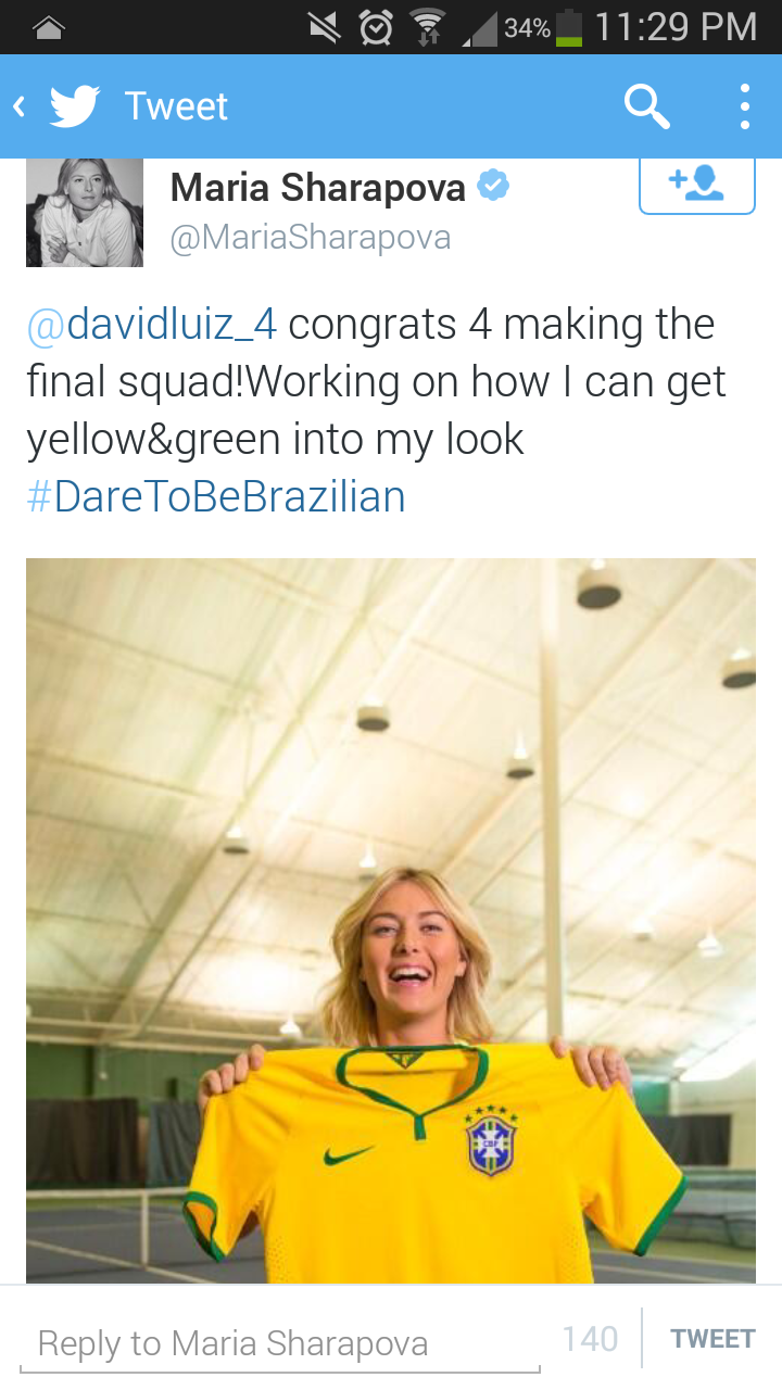 Suite à la parution de la liste des vingt-trois Brésiliens choisis par Luiz Felipe Scolari pour gagner la coupe du monde, la tenniswoman classée neuvième au classement WTA a affiché son soutien au défenseur de Chelsea David Luiz sur le réseau social Twitter, à l’aide d’un gazouillis envoyé dans la nuit de jeudi à vendredi.