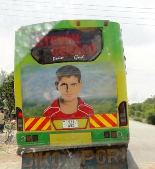 En Tanzanie visiblement, on est fan de Steven Gerrard. Assez pour qu’il soit dessiné sur l’arrière d’un car local. Sauf que la peinture est dégueulasse et le nom mal écrit.