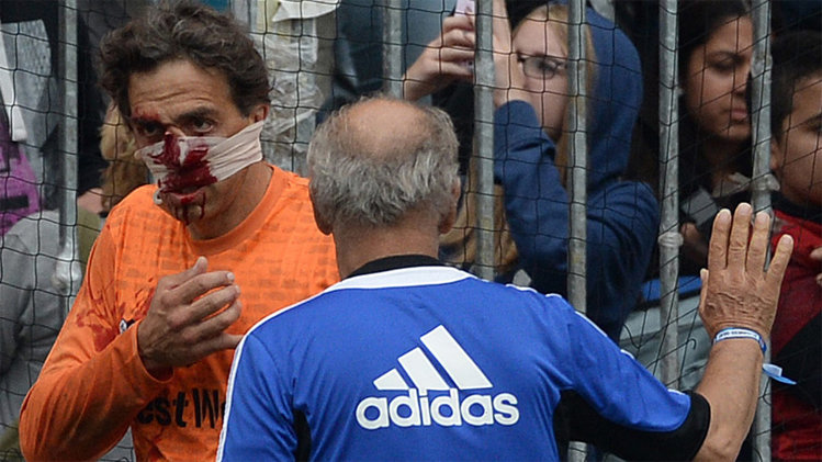 La scène s’est déroulée lors de la 9e édition du « Tag der Legenden » (Match des Légendes) à laquelle participaient notamment Lothar Matthäus, Jürgen Klopp ou Michael Schumacher. Sur une action dans la surface de répartion, Reitmaier, ancien gardien de Wolfsburg, et Dinzey, ancien milieu de St. Pauli, ont expérimenté un terrible choc front-nez qui a laissé les deux joueurs avec de belles séquelles.