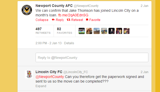 D’autres clubs aussi, peuvent réagir. Ainsi, quand Newport County, club de Conference National (cinquième échelon anglais) officialise la venue d’un joueur sur Twitter : « Nous confirmons que Jake Thomson a rejoint Lincoln City sous forme de prêt » , l’autre club concerné, Lincoln City, réagit directement avec un nouveau tweet : « Dans ce cas, pourriez-vous nous envoyer les papiers nécessaires pour conclure la transaction ??? »