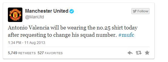 Lorsque Antonio Valencia avait fait ses débuts à Manchester United, en 2009, il portait le numéro 25. Mais dès l’année suivante Antonio s’est chauffé : il a décidé d’enfiler le fameux numéro 7 des Red Devils. Pas franchement incroyable depuis, l’équatorien c’est peut-être dit qu’il valait mieux la jouer modeste. N’est pas Best, Cantona, Beckham ou Ronaldo qui veut. En tout cas Manchester United a annoncé hier sur twitter que Valencia reprenait son numéro 25. Pour laisser le 7 à l’Histoire, ou à quelqu’un d’autre ?