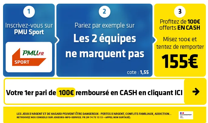 ► Le pari « les 2 équipes ne marquent pas » est coté à 1,55 chez PMU Sport qui vous rembourse votre 1er pari de 100€ remboursé EN CASH.