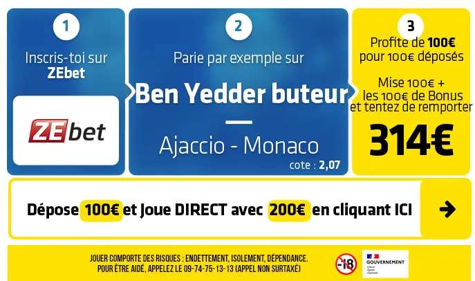 ► Le pari « Victoire Monaco » est coté à 1,70 chez ZEbet qui vous permet de récupérer 100€ DIRECT de Bonus (Déposez 100€ et misez avec 200€) avec le code SOFOOTX2