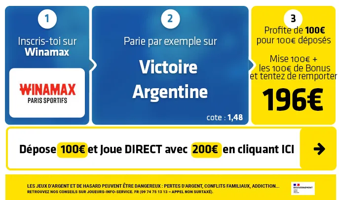 ► Le pari « Victoire Argentine » est coté à 1,48 chez Winamax qui vous permet de récupérer 100€ DIRECT (déposez 100€ et jouez avec 200€).