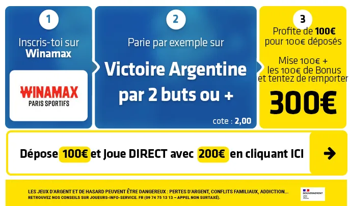 ► Le pari « l’Argentine gagne avec au moins 2 buts d’écart » est coté à 2,00 chez Winamax qui vous permet de récupérer 100€ DIRECT (déposez 100€ et jouez avec 200€).