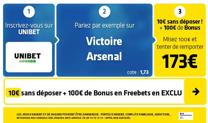 ► Le pari « Victoire Arsenal » est coté à 1,73 chez Unibet qui vous accueille en ce moment avec un bonus EXCLU de 110€ en utilisant le code « SOFOOT » : 10€ sans déposer d’argent + 100€ de bonus classique