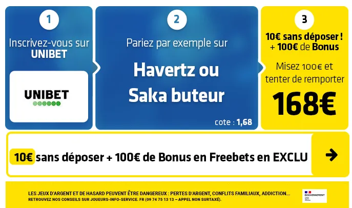 ► Le pari « Havertz ou Saka buteur » est coté à 1,68 chez Unibet qui vous accueille en ce moment avec un bonus EXCLU de 110€ en utilisant le code « SOFOOT » : 10€ sans déposer d’argent + 100€ de bonus classique