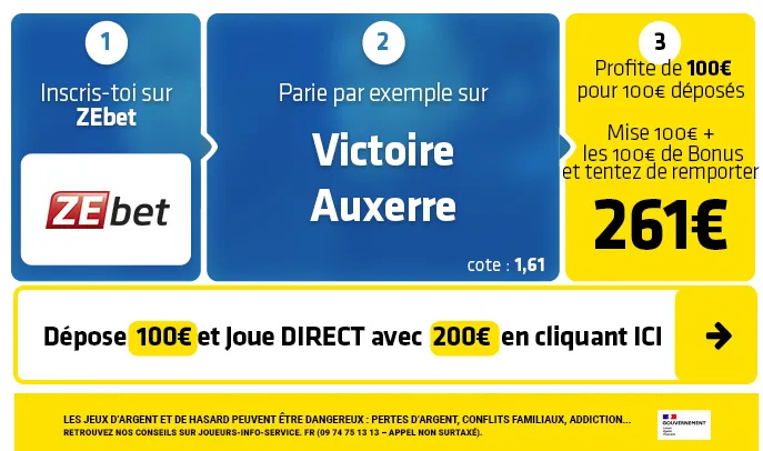 ► Le pari « Victoire Auxerre » est coté à 1,61 chez ZEbet qui vous permet de récupérer 100€ de bonus FORCÉMENT sur votre 1er pari avec le code SOFOOTX2 (Pariez 100€ et obtenez 100€ de bonus).