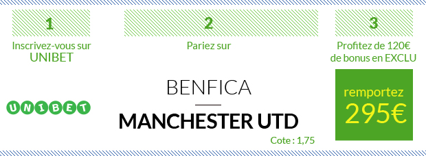 ► Si vous avez envie de tester d’autres sites de paris sportifs, vous pouvez profiter d’autres Bonus sur ce Benfica – Manchester United : – Un bonus EXCLUSIF de 120€ avec NetBet en rentrant le code « SOFOOT » – Un bonus ÉNORME de 150€ avec ZEbet, dont 60€ pour 20€ déposés – Un Bonus ÉNORME de 200€ dont un premier pari remboursé de 100€ avec France Pari – Un premier pari remboursé de 50€, pour un bonus total de 250€ (1er pari remboursé de 50€ + 100€ de Bonus sur votre 1er dépôt + 100€ à utiliser dans les Casinos JOA), avec Joa Sport – Un bonus paris sportifs de 100€ avec PMU Sport