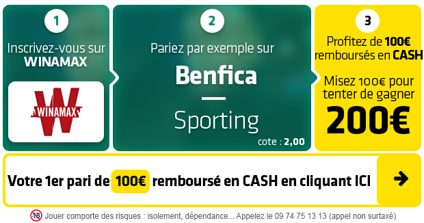► La victoire du Benfica est cotée à 2,00 chez Winamax qui offre un 1er pari remboursé de 100€ EN CASH