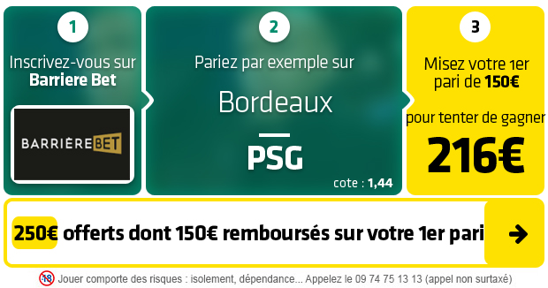 ► Si vous avez envie de tester d’autres sites de paris sportifs, d’autres sites vous permettent de parier sur ce Bordeaux PSG : – Un 1er pari remboursé EN CASH de 100€ avec Winamax – Un 1er pari remboursé EN CASH de 100€ avec PMU Sport – Un 1er pari remboursé de 150€ au lieu de 100€ avec ParionsSport En Ligne – Un bonus EXCLUSIF de 120€ avec Unibet qui vous offre 120€ de bonus au lieu de 100€ – Un bonus de 100€ SANS CONDITION avec Betclic qui vous offre 100€ de paris gratuits peu importe que votre 1er pari soit gagnant ou perdant – Un bonus ÉNORME de 150€ avec ZEbet, dont un premier pari remboursé de 100€ – Un bonus EXCLUSIF de 160€ avec NetBet, dont un 1er pari remboursé de 150€, en rentrant le code « SOFOOT » – Un premier pari remboursé de 120€ chez avec bwin – Un 1er pari remboursé de 100€ + 10€ offert SANS SORTIR LA CB avec PasinoBet, dont un premier pari remboursé de 100€ – Un bonus ÉNORME de 150€ sur vos 1ers paris sportifs avec France Pari – 150€ remboursés avec VBET, sponsor de Monaco – Un 1er pari remboursé de 100€ avec PokerStars Sports