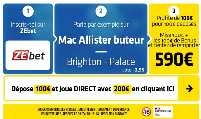 ► Le pari « Mac Allister buteur » est coté à 2,95 chez ZEbet qui vous permet de récupérer 100€ DIRECT de bonus (Déposez 100€ et misez avec 200€) avec le code SOFOOTX2.