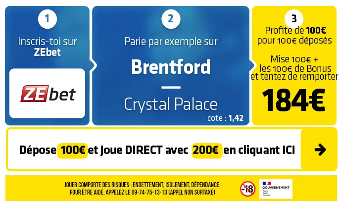 ► Le pari « Victoire Brighton » est coté à 1,42 chez ZEbet qui vous permet de récupérer 100€ DIRECT de bonus (Déposez 100€ et misez avec 200€) avec le code SOFOOTX2.