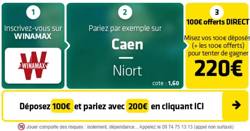 En face, Niort devrait vivre un exercice compliqué. En effet, les Chamois ont obtenu plutôt tranquillement leur maintien l’an passé alors qu’ils avaient été proche d’être relégués les 2 saisons précédentes. Pour lancer ce nouvel exercice, les Niortais ont subi le départ surprise de leur entraineur Sébastien Desabre, partir prendre les rênes de la sélection de la République Démocratique du Congo. Ce changement semble avoir inhibé le club niortais qui aligne les contre-performances. En effet, depuis sa nomination Rui Almeida n’a toujours pas gagné le moindre match et a vu son équipe s’incliner lors de 4 des 6 dernières journées. Le week-end dernier, les Chamois ont stoppé cette mauvaise passe en réalisant le nul face à Guingamp (0-0). Dernier de Ligue 2, Niort se trouve déjà au pied du mur. Devant son public, Caen, malgré son passage difficile, devrait s’imposer face à une formation niortaise dans le dur. ► Le pari « Victoire Caen » est coté à 1,60 chez Winamax qui vous offre 100€ DIRECT (déposez 100€ et jouez avec 200€). ► Profitez de 100€ offerts DIRECT pour 100€ déposés chez Winamax– Inscrivez-vous en cliquant ici. – Winamax vous offre le montant de votre 1er dépôt jusqu’à 100€. – Déposez par exemple 100€ et misez avec 200€ !- Misez par exemple vos 100€ déposés (+ les 100€ offerts) sur ce pari et tentez de gagner 220€ (320€ – les 100€ de paris gratuits retirés après le pari).- Vous avez le droit en + à 500€ de bonus pour jouer au poker.
