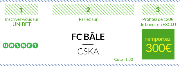 ► Si vous avez envie de tester d’autres sites de paris sportifs, vous pouvez profiter d’autres Bonus sur ce FC Bâle – CSKA Moscou : – Un bonus EXCLU de 210€, dont un 1er pari remboursé de 190€ avec NetBet – Un bonus ÉNORME de 150€, dont 60€ à récupérer très facilement avec ZEbet – Un NOUVEAU bonus de 100€, dont un 1er pari remboursé de 50€ avec BetStars – Un remboursement EN CASH de 100€ avec ParionsSport En Ligne – Un bonus ÉNORME de 200€, dont un premier pari remboursé de 100€ avec France Pari – Un premier pari remboursé de 50€ avec Genybet – Un bonus paris sportifs de 100€, avec PMU Sport – Un 1er pari remboursé 50€ chez Genybet