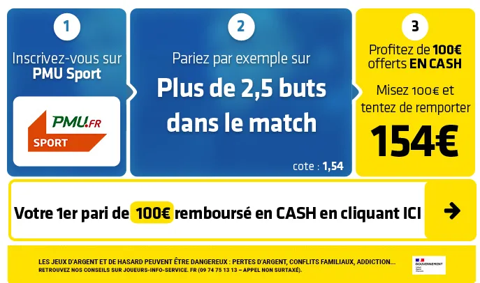 ► Le pari « plus de 2,5 buts » est coté à 1,54 chez PMU Sport qui vous rembourse votre 1er pari de 100€ remboursé EN CASH.
