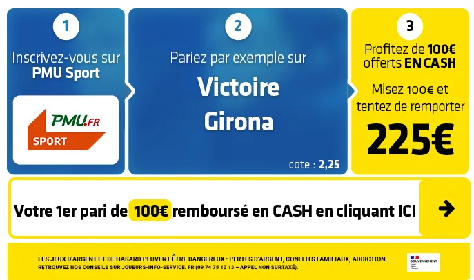 ► Le pari « victoire Girona » est coté à 2,25 chez PMU Sport qui vous rembourse votre 1er pari de 100€ remboursé EN CASH.