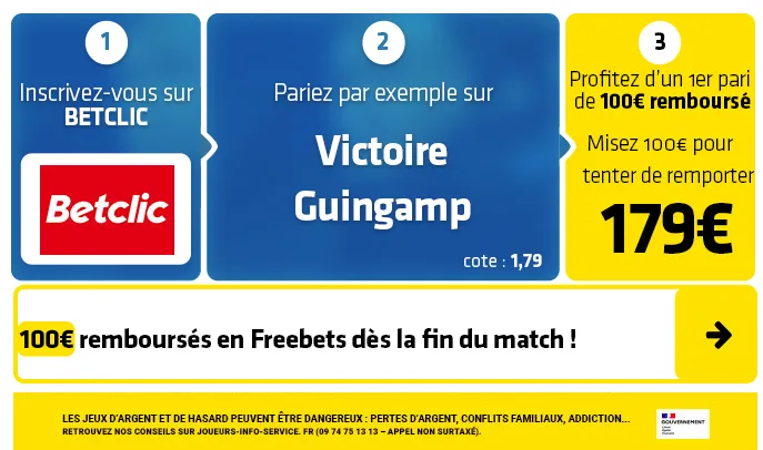 ► Le pari « Victoire Guingamp » est coté à 1,79 chez Betclic qui vous permet d’obtenir votre 1er pari remboursé de 100€.